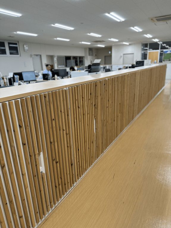 事務所の棚はもともと白色の無地でしたが、木製の格子を貼り付けたことで事務所床の雰囲気とうまくマッチングし、雰囲気に統一感が生まれました。視覚的にも主張することがないため、集中して会議に望むことができるという意見もいただいております。
