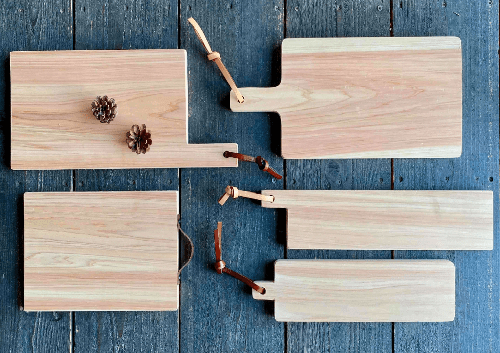 富士ヒノキのカッティングボード作り: まな板としてはもちろん、そのまま食卓へ出せるお皿代わりとしても大活躍。お好みの形や取手を選び、自分好みの逸品に仕上げることができます。