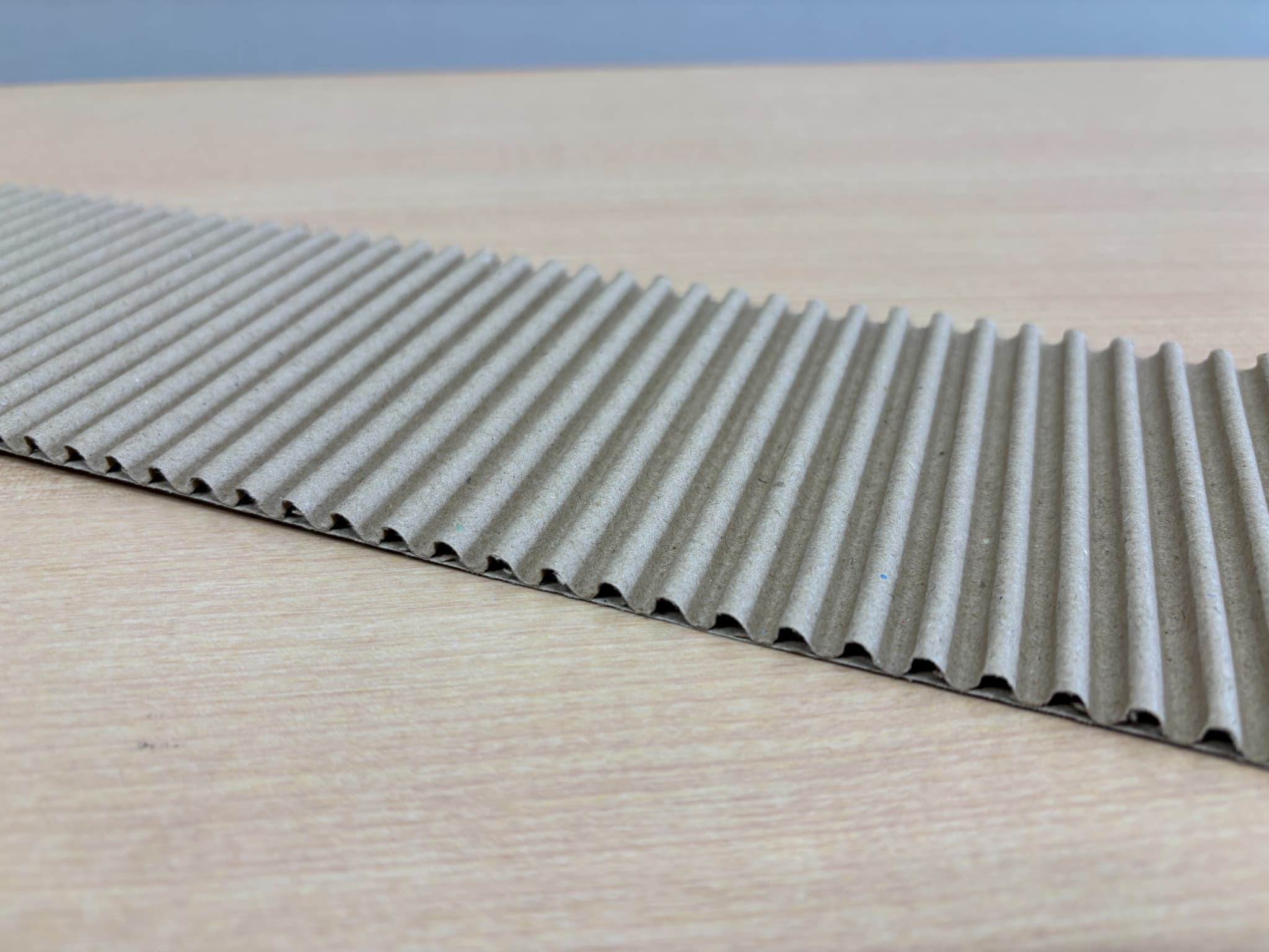 波のような形に加工した紙を平らな紙で挟む構造になっており、この構造によって軽くて丈夫な素材が生まれました。