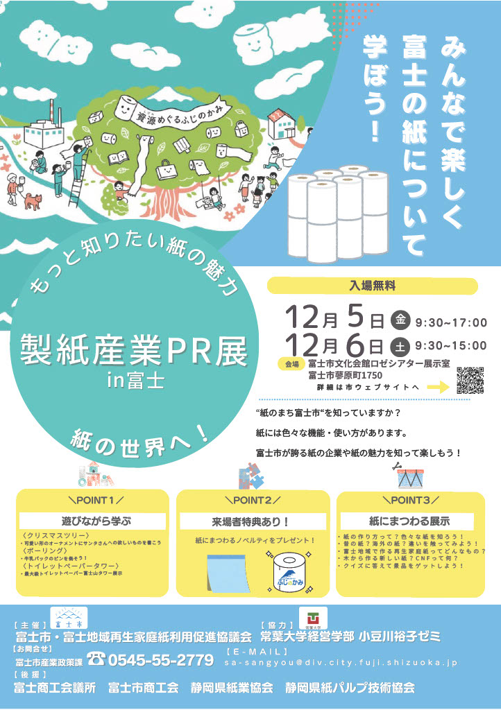 Home NEWS 製紙産業PR展 in 富士 ~もっと知りたい紙の魅力~ が開催されます! 製紙産業PR展 in 富士 ~もっと知りたい紙の魅力~ が開催されます! 2025.12.3 NEWS 富士市の主要産業である製紙業の魅力をご堪能下さい! 12月5日(金)9:30~17:00/12月6日(土)9:30~15:00に、『製紙産業PR展 in 富士 』がロゼシアター展示室にて開催されます。 この展示会は、市内外の来場者等に向けた富士地域の製紙企業のPRを行うとともに、紙の文化に触れることによる地元産業への興味・関心の醸成や紙やセルロースの魅力を伝えることを目的としたものです。 弊社は、会社スペース内で、展示パネル・ダンレット・ダンボールベッドを中心とした展示をさせていただきます。 当日は、富士市内の製紙に関連する企業・団体の出展の他、クイズイベントや来場者特典等様々なプログラムが企画されておりますので、ご興味のある方は是非お越しください! 【イベント情報】 https://cnf-fuji-pf.jp/event/%E5%AF%8C%E5%A3%AB%E5%B8%82%E3%81%AE%E3%82%A4%E3%83%99%E3%83%B3%E3%83%88/%E3%81%94%E6%A1%88%E5%86%85%E3%83%BB%E5%AF%8C%E5%A3%AB%E5%B8%82_%E8%A3%BD%E7%B4%99%E7%94%A3%E6%A5%ADpr%E5%B1%95-in-%E5%AF%8C%E5%A3%AB2025/ Tweet Share RSS